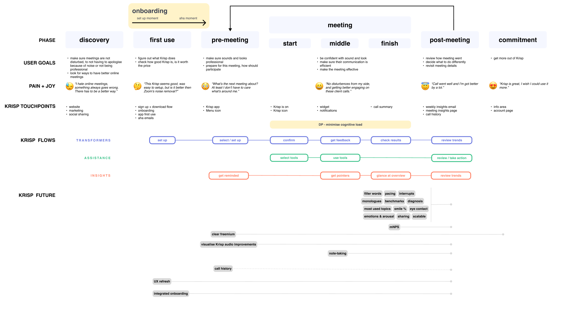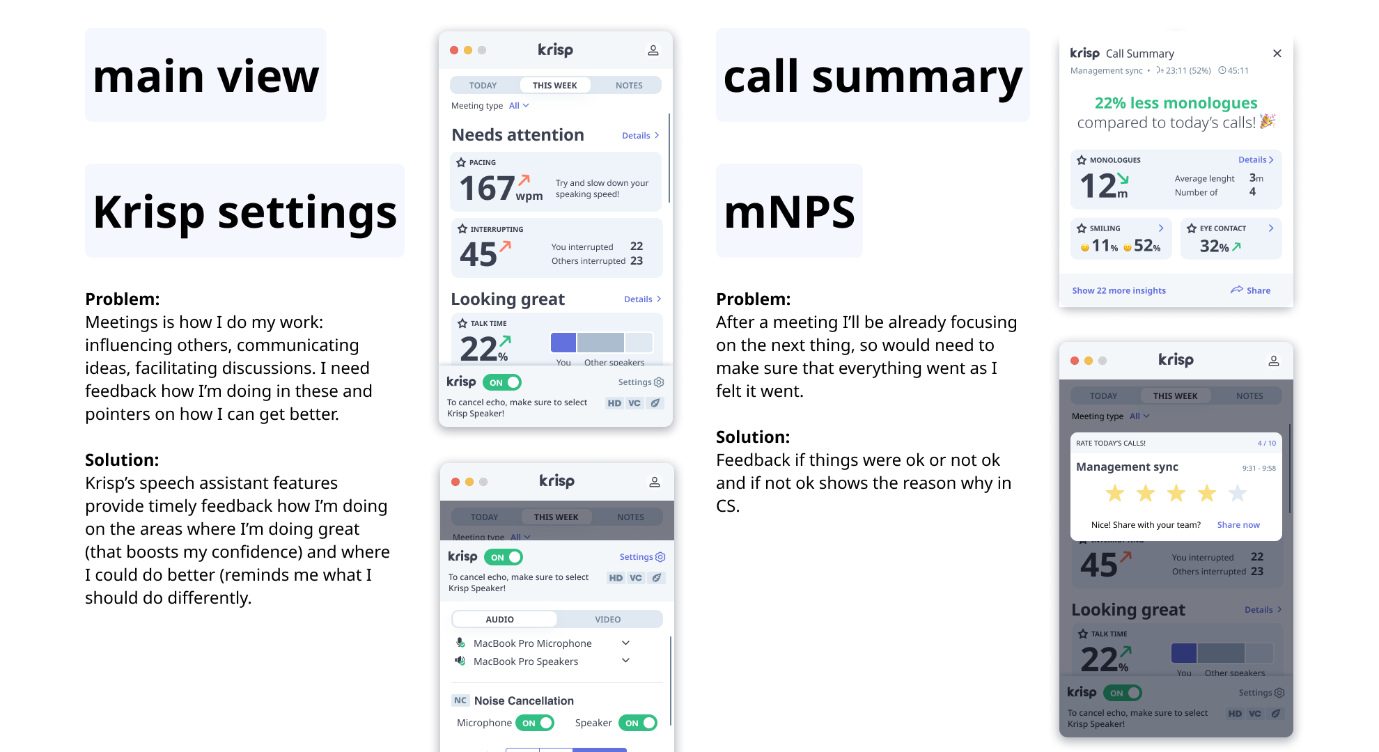 As the lead designer at Krisp, I faced a key challenge: the product was being built feature-by-feature as new technology became available, resulting in a fragmented user journey and a lack of clear strategic direction. I took on a project to create a product vision that would unify our efforts, address user problems, and drive long-term strategy.