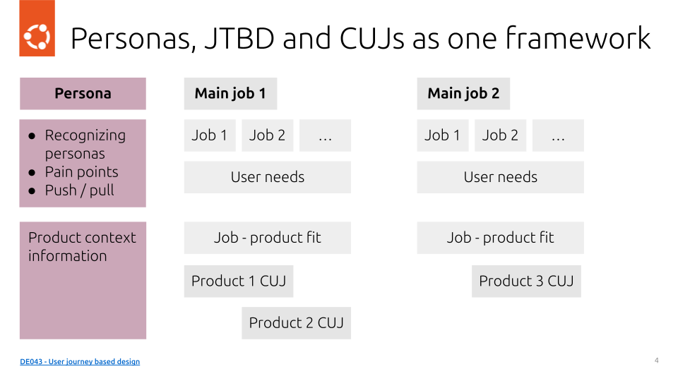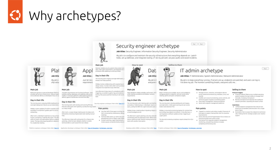 Canonical has a wide portfolio of over 60 deeply technical products. After I joined, I recognized that this breadth makes it increasingly challenging to have meaningful conversations about target user segments across marketing, sales, product, design, and engineering. There was a good understanding of the audience in the product teams through community engagement and plenty of dogfooding, but transmitting learning between teams was where things broke down. This led to friction both within a single product’s experience and cross-product experiences in the portfolio, for example sales not targeting the right type of customers.