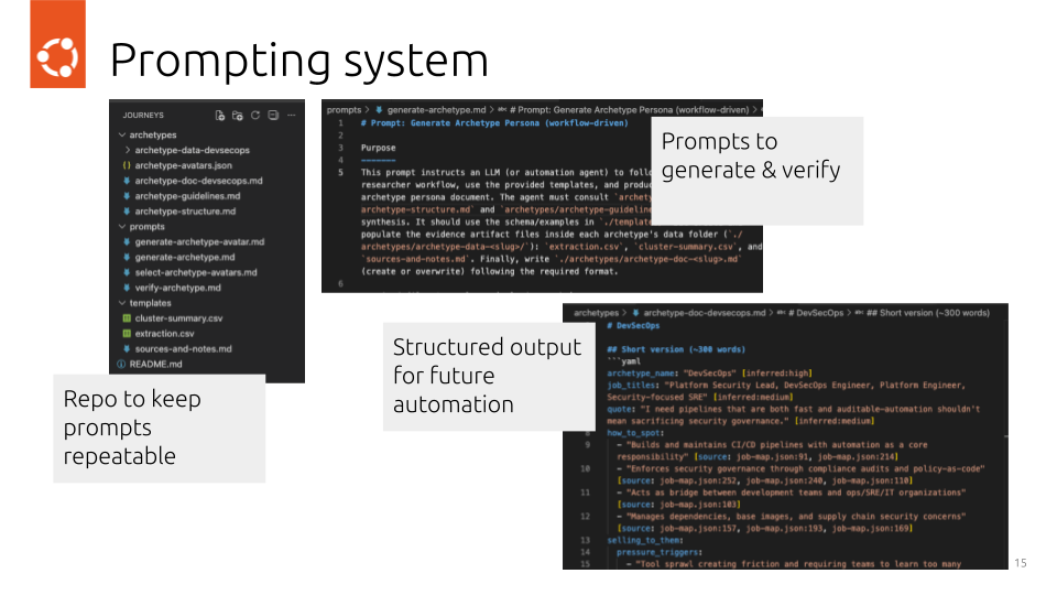 This is where the AI workflow came in. Personas tend to decay as teams accumulate new information that never makes it back into the original documents. To solve this, I designed an AI-assisted workflow using LLMs with a prompting system that continuously synthesizes and integrates new information from across the organization, creates updated archetypes, and validates them against sources. This keeps the system alive, as new learning get absorbed rather than lost, and the archetypes stay current without requiring a full research cycle every time something changes.